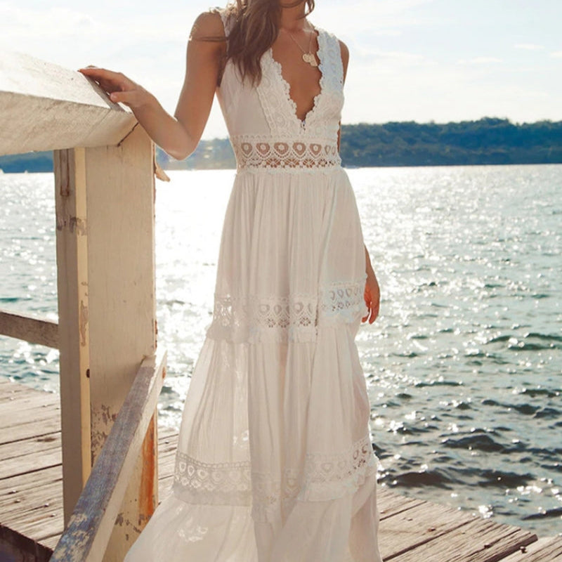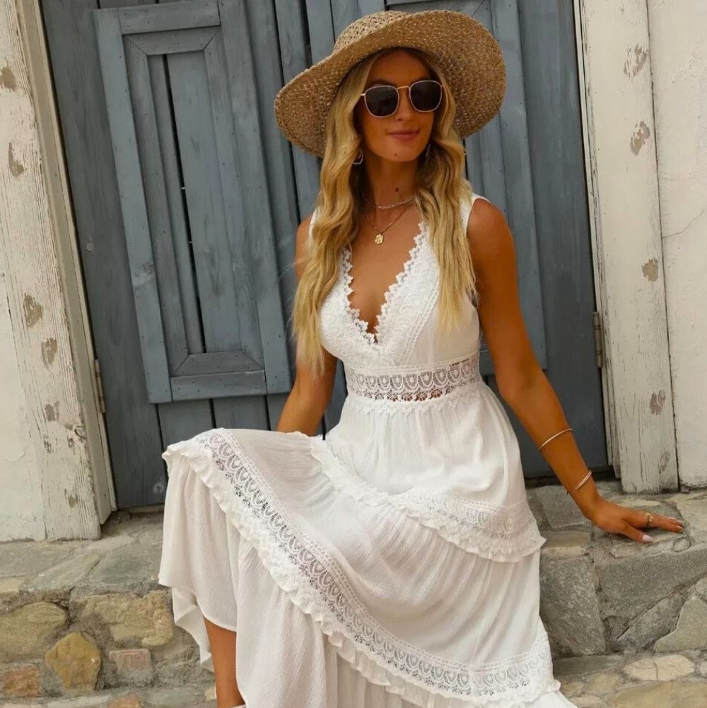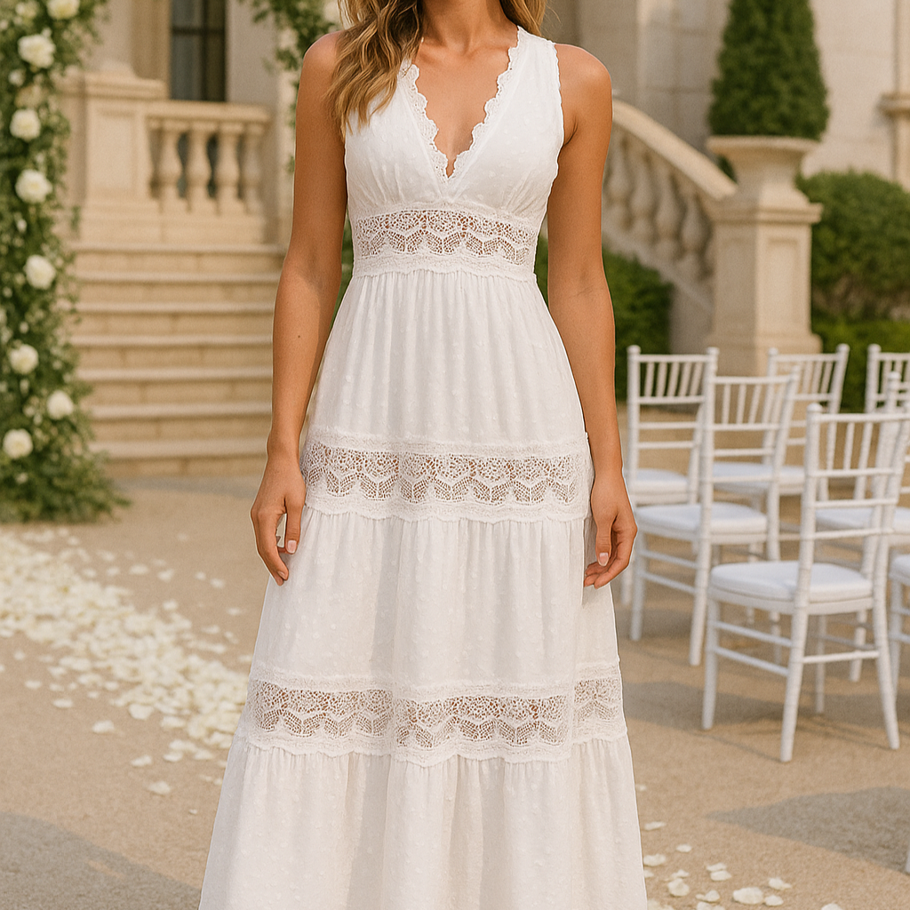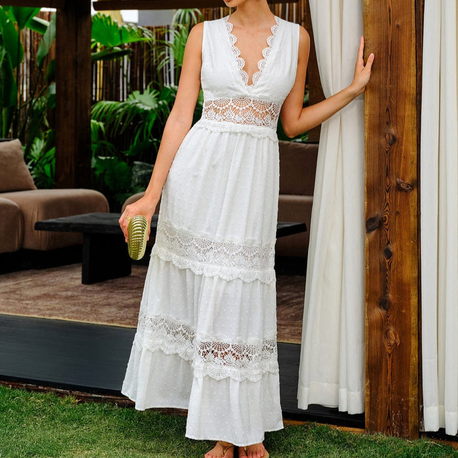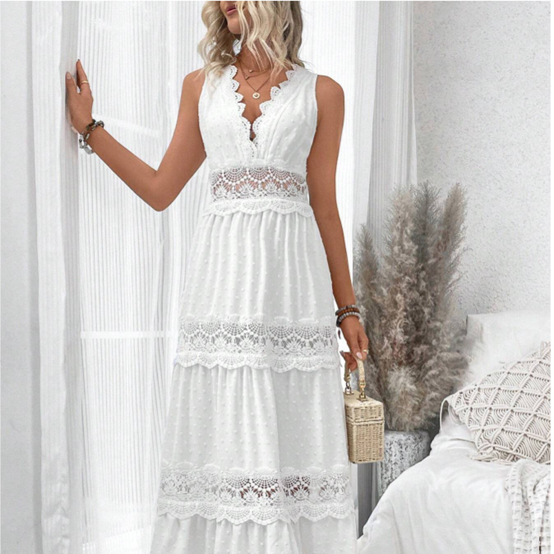 Baxy™ la Robe longue sans manches en dentelle blanche, parfaite pour sublimer vos journées ensoleillées et vos soirées d’été. Son tissu léger, fluide et respirant vous assure un confort total, même par forte chaleur.